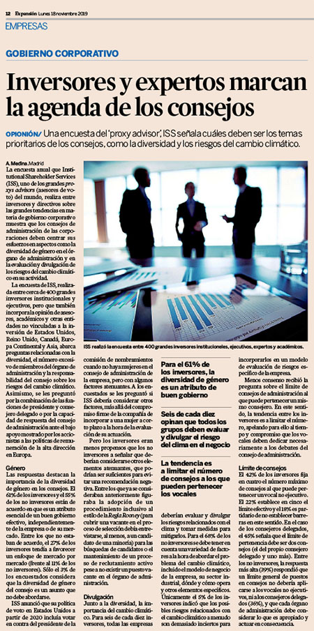 La encuesta anual que Institutional Shareholder Services (ISS), realiza entre inversores y directivos sobre las grandes tendencias en materia de gobierno corporativo, indica que los consejos deben enfocarse en temas como la diversidad de género, y en la evaluación y divulgación de los riesgos del cambio climático. Puedes ver la nota completa en este enlace.