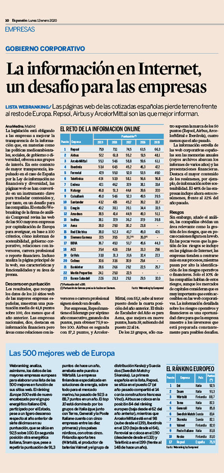 El estudio Webranking de la firma de análisis Comprend revisa las web de las 900 mayores empresas por capitalización de Europa para averiguar, en base a 100 criterios, cómo informan de sostenibilidad, gobierno corporativo, relaciones con inversores, carrera profesional o reporte financiero.