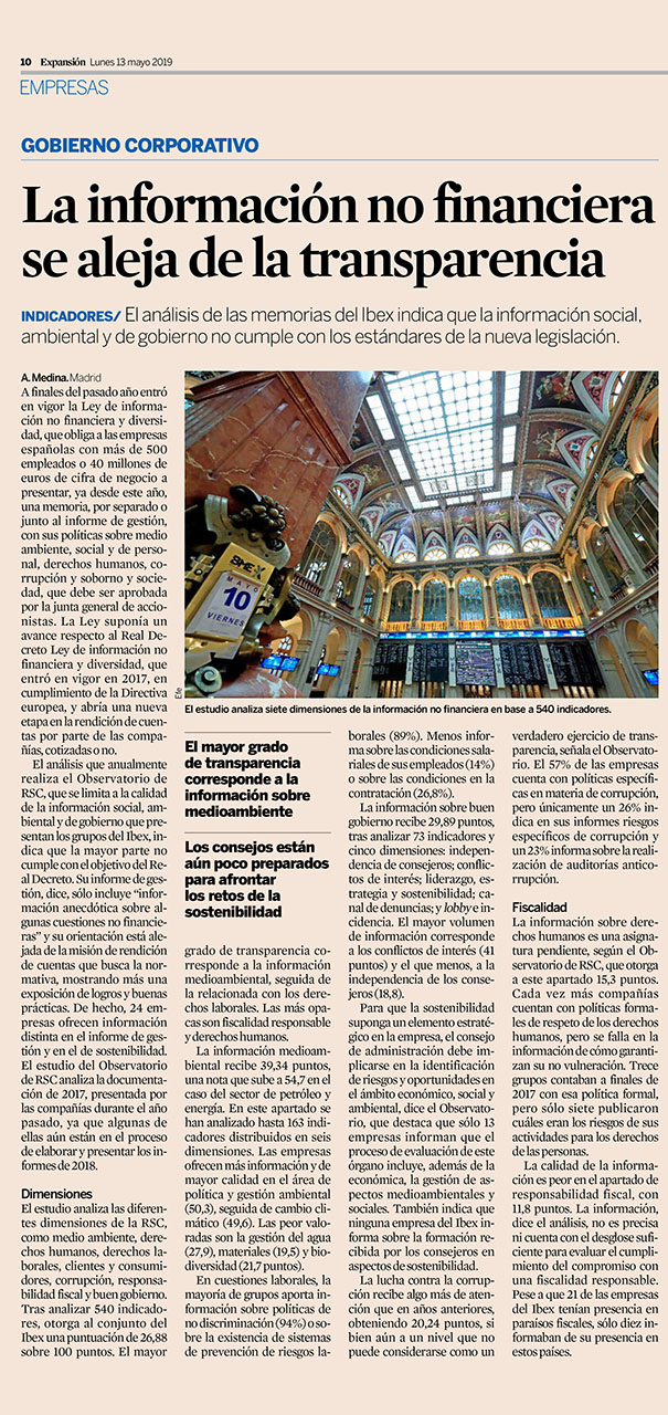 El análisis que anualmente realiza el Observatorio de RSC, que se limita a la calidad de la información social, ambiental y de gobierno que presentan los grupos del Ibex, indica que la mayor parte no cumple con el objetivo de la Ley de información no financiera y diversidad.