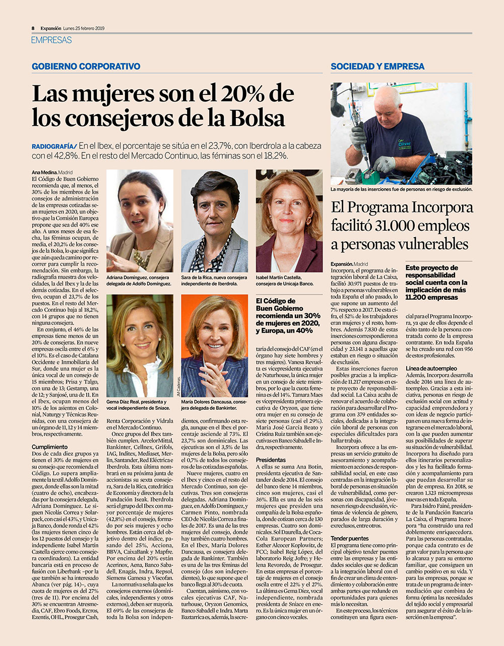 El Código de Buen Gobierno recomienda que, al menos, el 30% de los miembros de los consejos de administración de las empresas cotizadas sean mujeres en 2020, un objetivo que la Comisión Europea propone que sea del 40% ese año.
