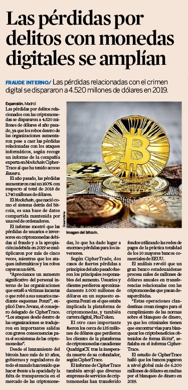 Las pérdidas por delitos relacionados con las criptomonedas se dispararon a 4.520 millones de dólares el año pasado, ya que los robos dentro de las organizaciones aumentaron pese a caer las pérdidas relacionadas con los ataques informáticos, según recoge un informe de la compañía experta en blockchain CipherTrace. Puedes ver la nota en este enlace.