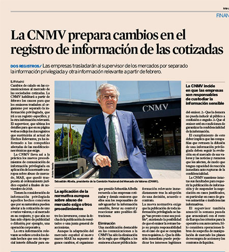 La CNMV habilitará a partir de febrero los cauces para que los emisores trasladen al organismo por separado la información privilegiada, que irá a un registro específico, y la otra información relevante. La CNMV lleva así a la práctica los…