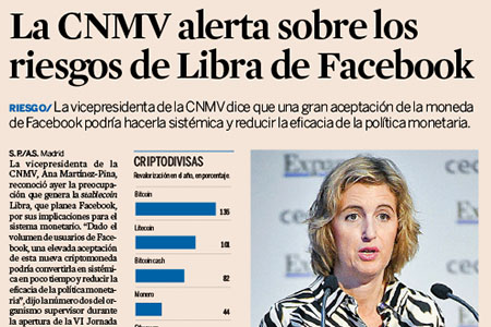 La vicepresidenta de la CNMV dice que una gran aceptación de la moneda de Facebook podría hacerla sistémica y reducir la eficacia de la política monetaria. Puedes ver la nota completa en este enlace.