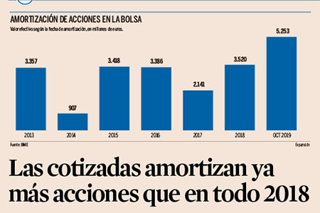 Las empresas de la Bolsa española están retirando de circulación títulos propios, con el consecuente aumento del dividendo y mejora en el beneficio por acción. Hasta octubre las cotizadas españolas amortizaron títulos por cerca de 5.300 millones de euros, con…