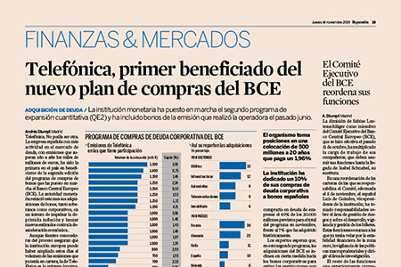 Telefónica la primera en el país en beneficiarse de la segunda edición del programa de compras de bonos. El BCE toma posiciones en una colocación de 500 millones a 20 años que paga un 1,96%.